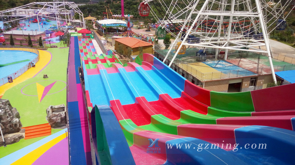 彩虹竞赛滑梯是一种非常经典且成熟的水上乐园游玩滑梯,多道并列设计,一般为2-8道、可以采用人体自滑或滑毯滑行来进行比赛。该设备的互动性较强,让游客可以跟家人,好友参与比赛当中,从中享受亲情,友情在游玩中带来无法比拟的欢乐!